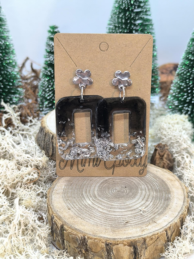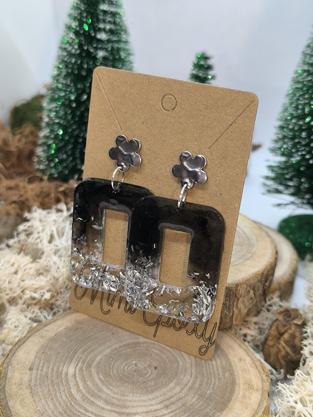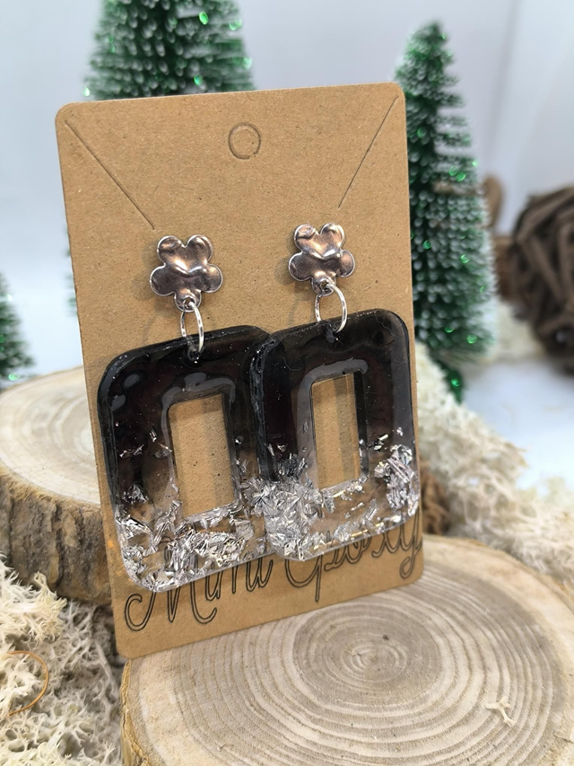 Boucles d'oreilles rectangle (large) noires et feuilles argentées