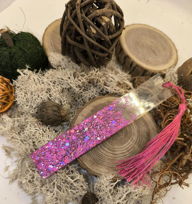 Ce marque-page rose pailleté, orné d’un élégant pompon, symbolise l’espoir et la solidarité.