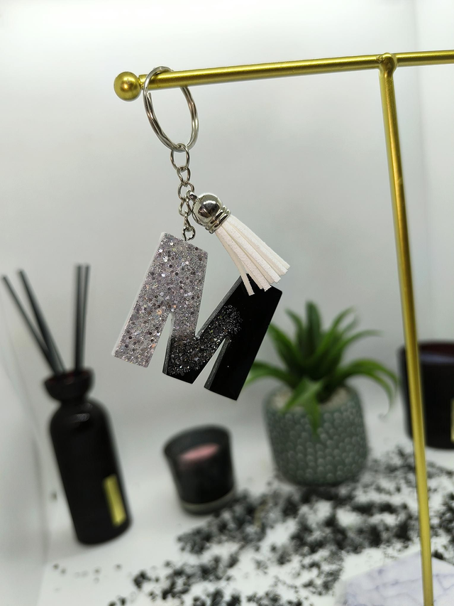 Porte clés initiale "M" noir paillettes argentées