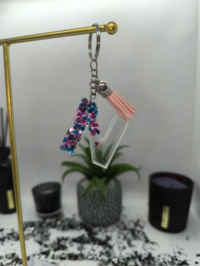 Porte clés initiale "N" transparent et coeurs bleu et rose
